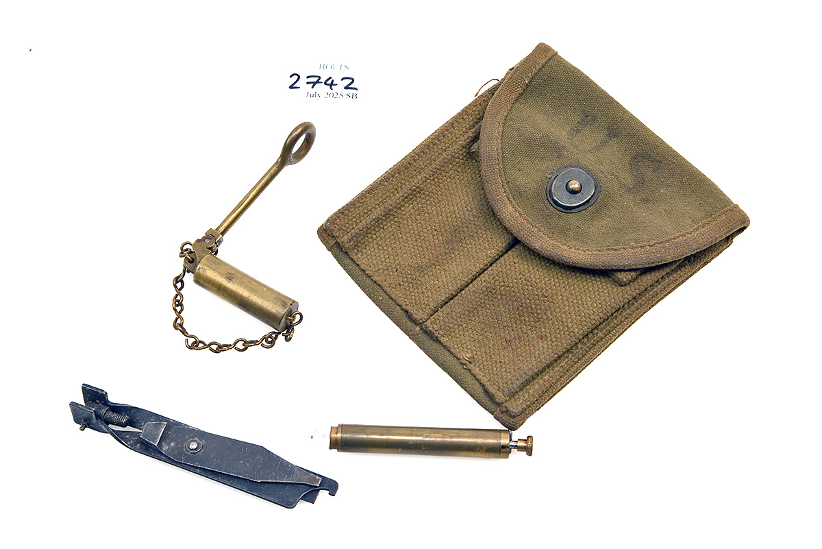 A 'US 1943' M1 CARBINE MAGAZINE POUCH AND RELATED ITEMS, 1 brass bore viewer, '1967' cleaning multi-tool, brass bore light (untested) (qty)