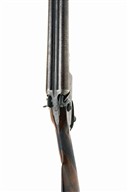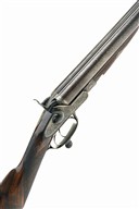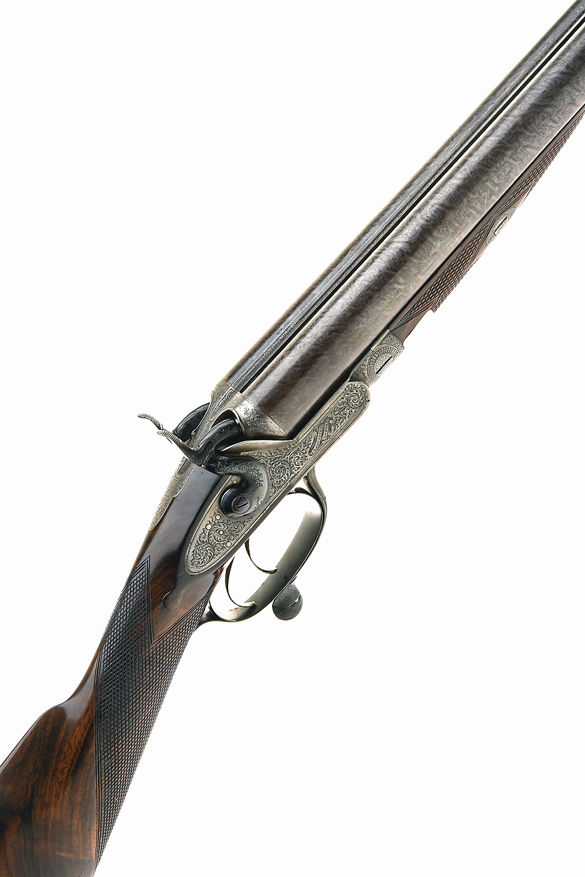 CHARLES LANCASTER 10-BORE (2 5/8IN.) DOUBLE-BARRELLED ROTARY-UNDERLEVER HAMMERGUN, serial no. 2805, circa 1855 (and conversion from muzzle loading or later build), 28in. nitro reproved bold twist damascus barrels (in 1970 at 2 5/7in.), the rib engraved 'CHARLES LANCASTER. 151. NEW BOND ST. LONDON.', Jones patent rotary-underlever, carved percussion fences, non-rebounding sidelocks, bold acanthus scroll engraving, the lockplates with scrolling banners engraved 'C. LANCASTER LONDON', the triggerguard with two hounds, the triggerguard tang with a brace of pheasant, brushed and blued finish, 14 3/8in. well-figured stock (some paint splashes) with steel buttplate, the buttplate with back strap engraved with scrollwork surrounding a scene of hound chasing fowl, fore-end with crosspin release and horn finial, weight 7lb. 14oz.