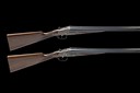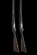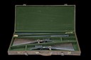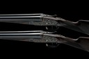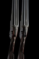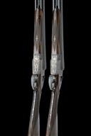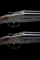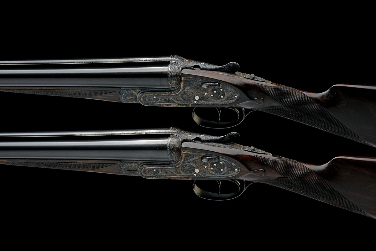 for 1974, 26in. nitro chopperlump barrels, ribs gold-inlaid '1' and '2', 2 3/4in. chambers, bored approx. imp. cyl. and 1/4 choke, removable striker discs, toplevers gold-inlaid '1' and '2', automatic safeties with gold-inlaid 'SAFE' details, hand-detachable lockplates, gold-inlaid cocking-indicators, articulated front triggers, rolled-edge triggerguards, acanthus scroll engraving with floral bouquets, retaining much original colour-hardening and finish, 14 5/8in. stocks, weight 6lb. 9oz., in a case