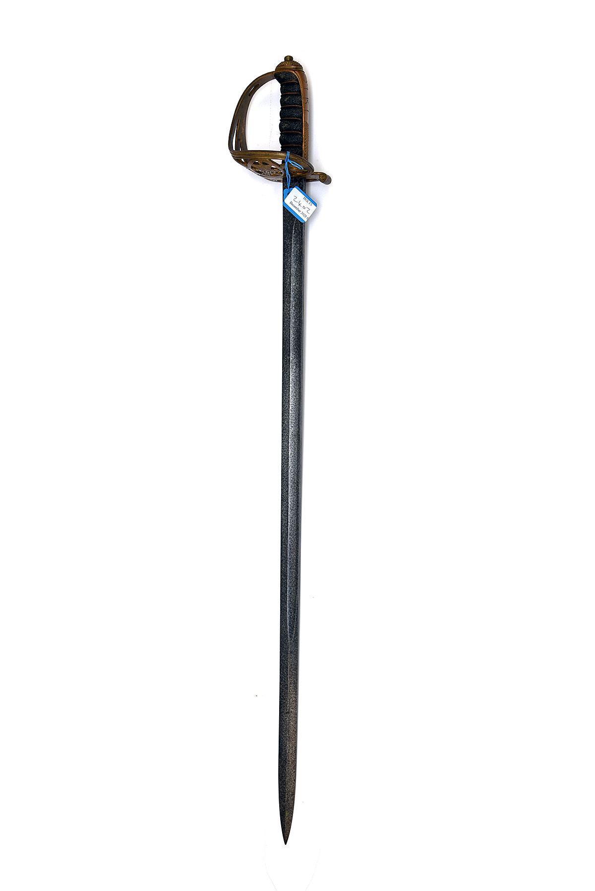 * A RARE PATTERN 1889 ARMY STAFF SERGEANT'S SWORD BY WILKINSON, dated 1898, with 32 3/4 in. single-edged blade fullered on each side, ricasso marked 'WILKINSON LONDON', date '5 '98' and two Wilkinson inspection mark strikes, with a further strike, bend-test 'X' and Broad Arrow over, Brass hilt with wire-bound fish-skin grip, pierced gothic guard with Victorian royal cypher, quillion stamped 'C /I\ G' [Cape Government ownership mark], backstrap with hand-punched rack number '39KI', blade heavily stained with some pitting, no scabbard