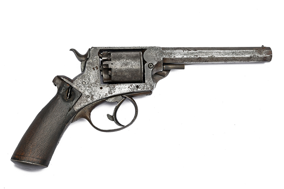 * A .44 5-SHOT PERCUSSION REVOLVER SIGNED TRANTER'S PATENT, serial no. 10738T, circa 1860s, with 6 in. octagonal barrel, closed frame, the top strap engraved 'John Hayton Graham's Town [south African retailer in Cape Colony], cylinder with Birmingham proof-marks, chequered wooden grips, heavily worn and pitted, action at fault, missing screws, grips damaged with losses