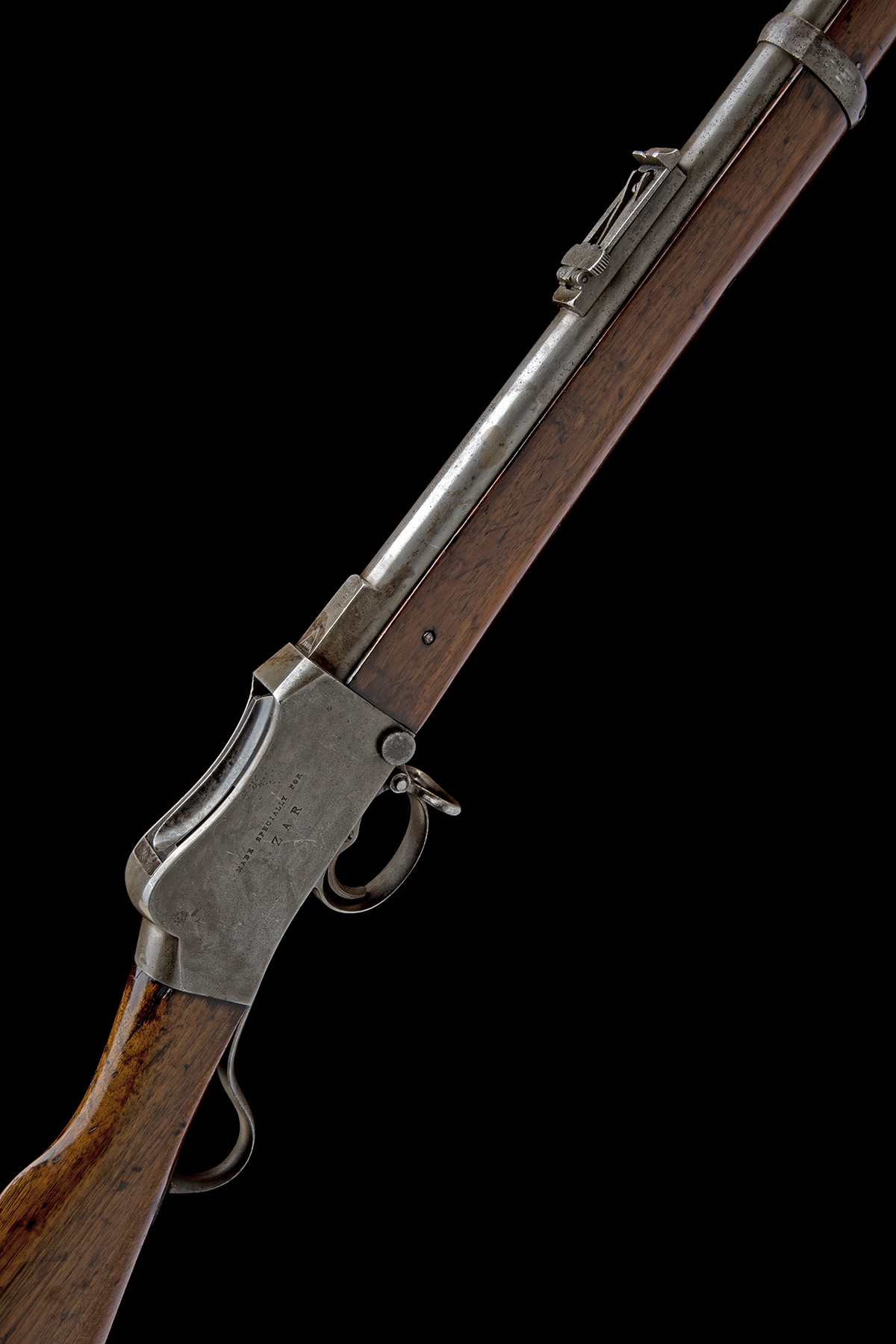 dated for 1897, with round 33 1/4in. barrel marked 'HENRY RIFLING' and 'WESTLEY RICHARDS & CO.', block and blade fore-sight, elevating ladder rear-sight, nocksform with triangular bordered date stamp, slab-sided receiver marked 'MADE SPECIALLY FOR Z.A.R.' on the right and 'WESTLEY RICHARDS & CO.' on the left, together a further triangle trademark, walnut butt-stock (refinished, small chip at toe), short under-lever and full-length fore-end with two iron barrel-bands, the front with bayonet lug, missing under-barrel clearing rod, lightly cleaned of finish with some isolated pitting