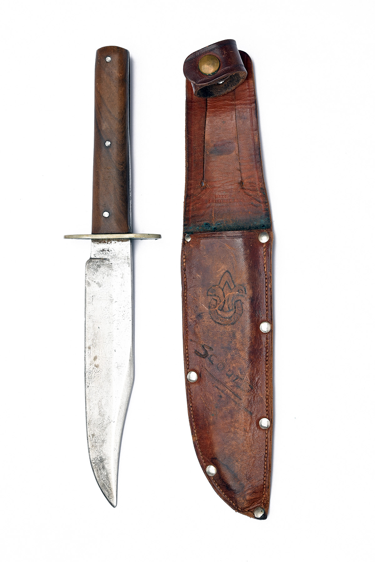 * A BOWIE KNIFE BY WADE & BUTCHER, late 19th-early 20th Century, with 5 3/4 in. single-edged steel blade with clipped point, forte stamped 'WADE & BUTCHER / SHEFFIELD / ENGLAND', alloy cross-guard, riveted wooden grips, together with its brown leather scabbard with belt loop, worn, scout crest hand marked on scabbard