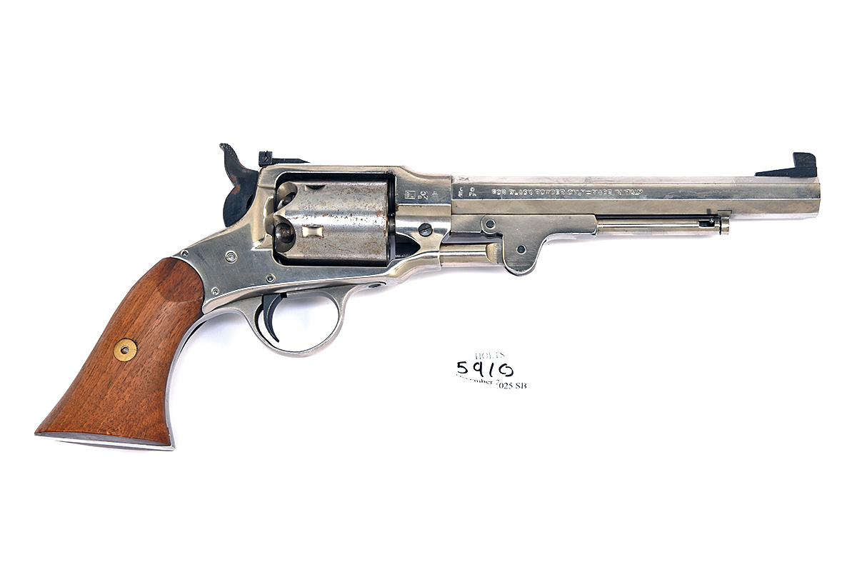 A REPRODUCTION .44 PERCUSSION 'EUROARMS' REVOLVER MODEL 'ROGER & SPENCER TARGET' serial no. 024926 with 7 1/2in. octagonal barrel, adjustable sights, solid frame, plain cylinder (light rusting), smooth flared walnut grips