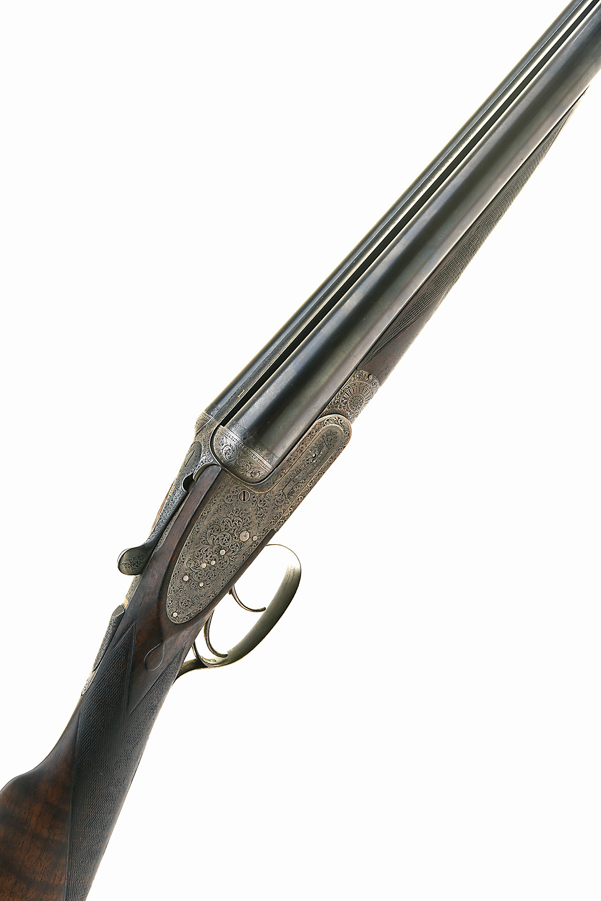 WATSON BROS. 12-BORE SIDELOCK EJECTOR, serial no. 7058, for 1908, 30in. nitro reproved barrels, the rib engraved 'WATSON BROS. 29. OLD BOND ST. LONDON.', 2 1/2in. chambers, bored approx. imp. cyl. and 1/4 choke, right wall at 16, treble-grip action with hidden third bite, toplever gold-inlaid '1', automatic safety with gold-inlaid 'SAFE' detail, fine bold acanthus scroll engraving with ornate bordering, retaining traces of colour-hardening, 14 7/8in. stock including 7/8in. wooden extension, weight 6lb. 8oz., in a canvas case
