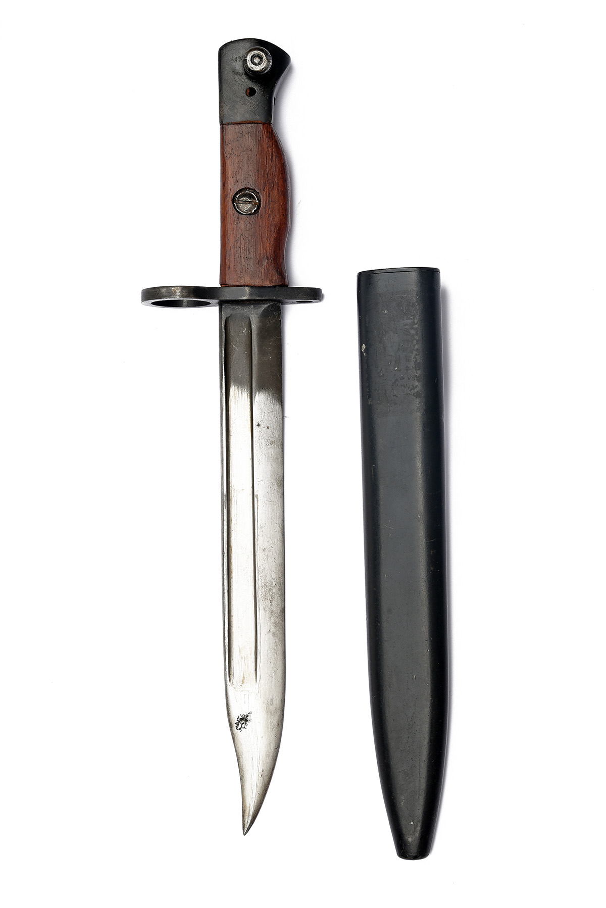 A No. 5 Mk 1 JUNGLE CARBINE STYLE BAYONET, probably an Indian copy purporting to be a First Pattern with single rivet grips, using a recycled blade and scabbard, 8 in. unmarked blade and somewhat crudely fashioned hilt and grip