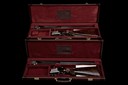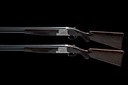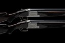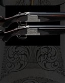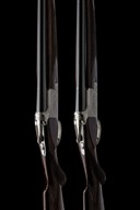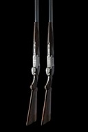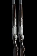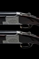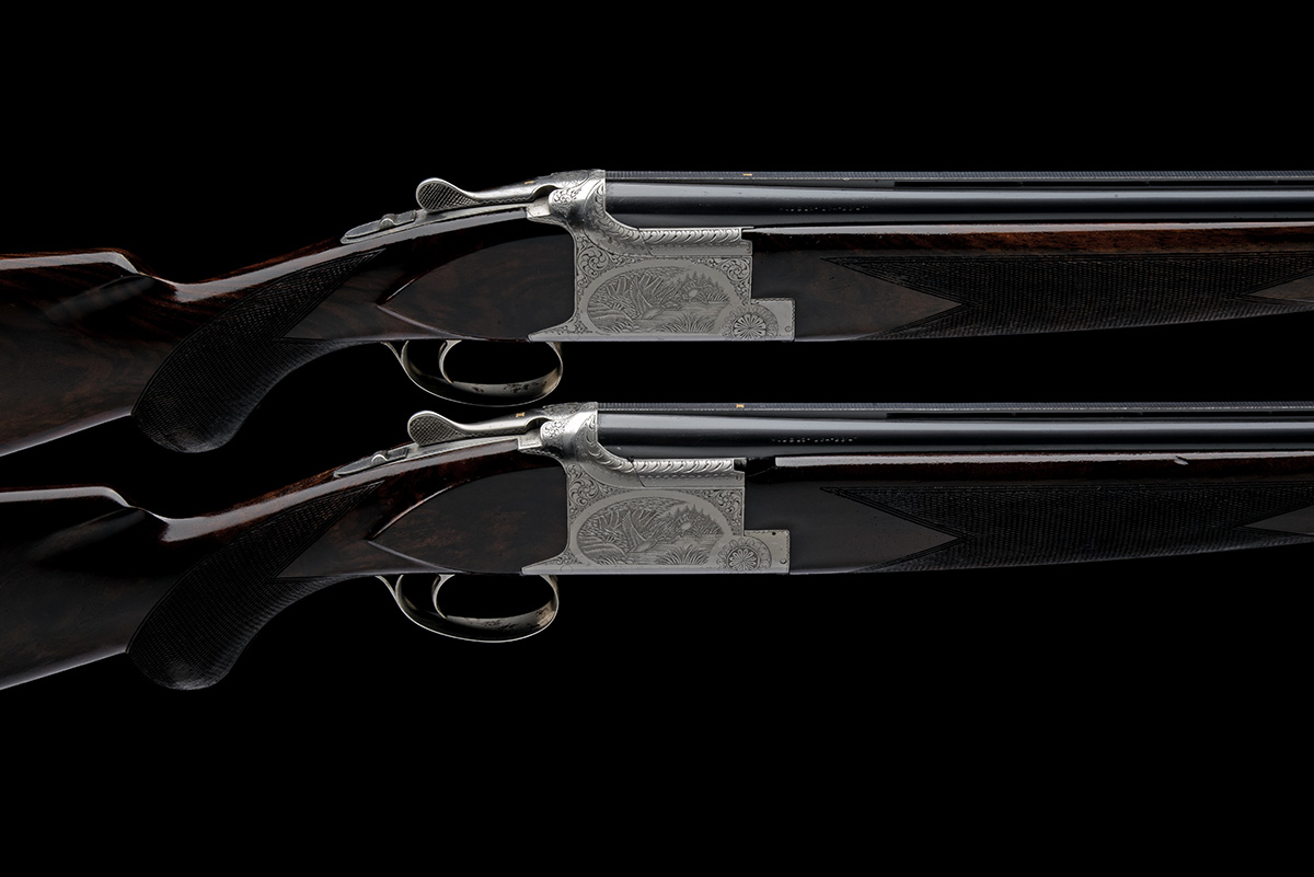 for 2000, 27 5/8in. nitro barrels, 6mm ventilated matt top-ribs gold-inlaid 'I' and 'II', 2 3/4in. chambers, bored approx. 1/4 and 1/2 choke, hold-open toplevers gold-inlaid 'I' and 'II', automatic safeties with integral barrel selector switches and gold-inlaid 'O', 'U' and 'S' details, bold acanthus scroll engraving with game scenes of pheasant and duck, No. I signed 'F. KRILL', No. II signed 'J.M. MARTENS', 14 3/8in. figured pistolgrip stocks including buttplates, No. I cracked at hand, weight 7lb. 2oz. (No. I) and 7lb. 6oz. (No.II), in their individual cases