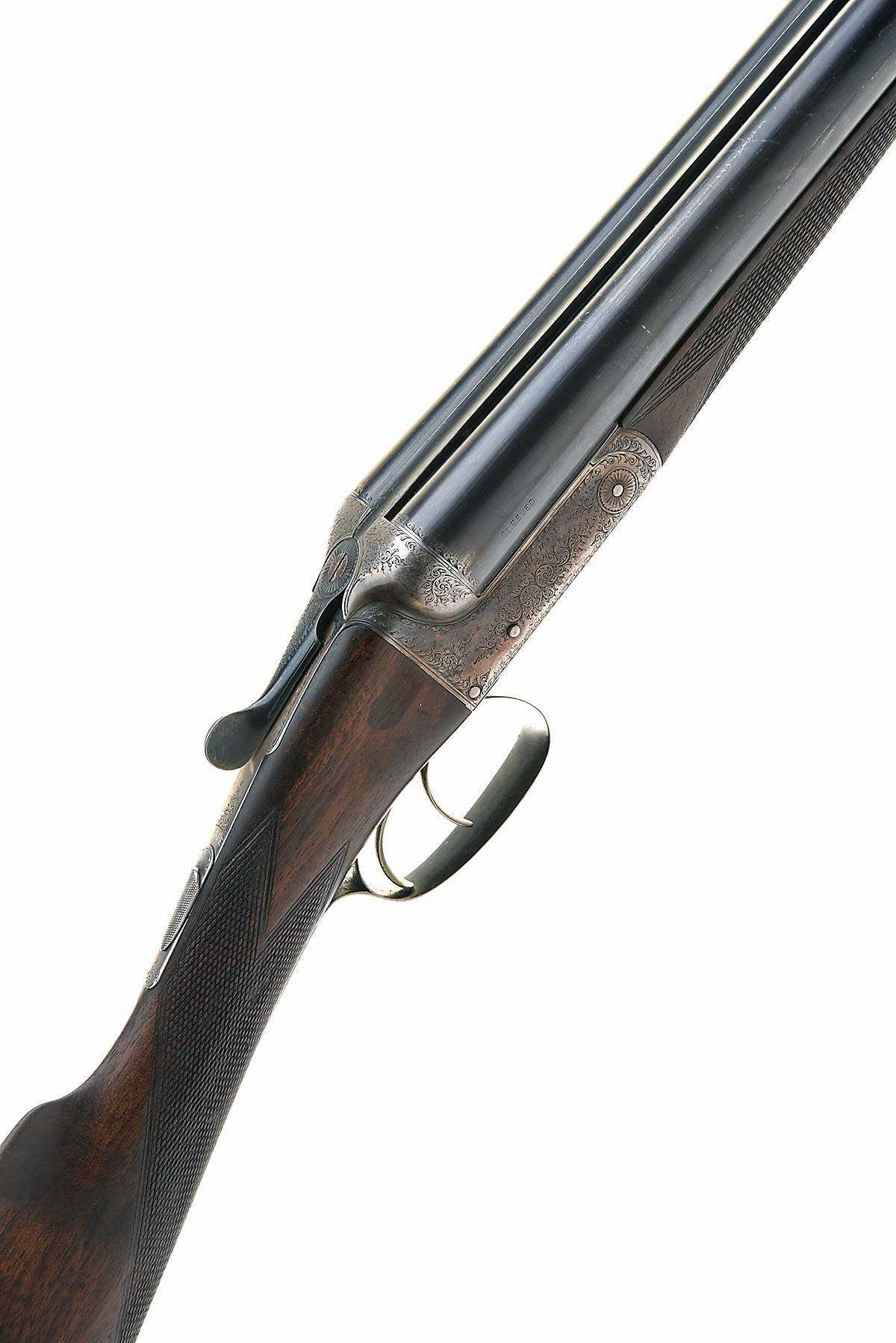 E. & G. HIGHAM 12-BORE BOXLOCK EJECTOR, serial no. 4717, circa 1900, 28in. sleeved nitro barrels, 2 1/2in. chambers, bored approx. 1/4 ad full choke, treble-grip action, automatic safety, border and partial scroll engraving, retaining traces of original colour-hardening and finish, 14 1/4in. stock (slight crack at hand) including 3/8in. extension, weight 6lb. 12oz., in a leather case
