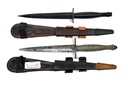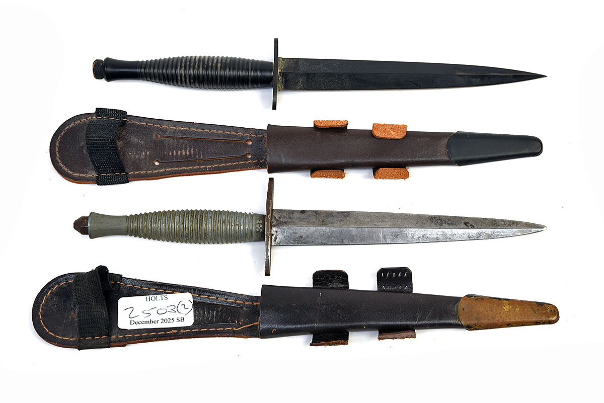 TWO POST-WAR FAIRBAIRN SYKES 3rd PATTERN COMMANDO KNIVES, with 7 in. double-edged blades, steel cross-guards, ribbed metal grips, leather scabbards with brass chapes, being 1) black-painted grip, cross-guard marked 'R. COOPER / SHEFFIELD / ENGLAND' appearing unused but dirty; 2) alloy grip, the base cast with the J. Nowill & Sons crossed keys and '* over D' marks, worn, blade stained with tip rounded (2)