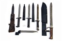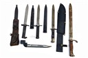FIVE BAYONETS, being 1) a No. 9, worn, no scabbard; 2) a German Model 1898 heavily worn, no scabbard; 3) a Siamese Type 45, heavily worn, wooden grips shaved down; 4) a Swedish Model 1896, heavily worn, pommel catch missing; 5) a better Swedish Model 1896 with clear ricasso markings and unit marks to the cross-guard, together with its brown leather frog (5)