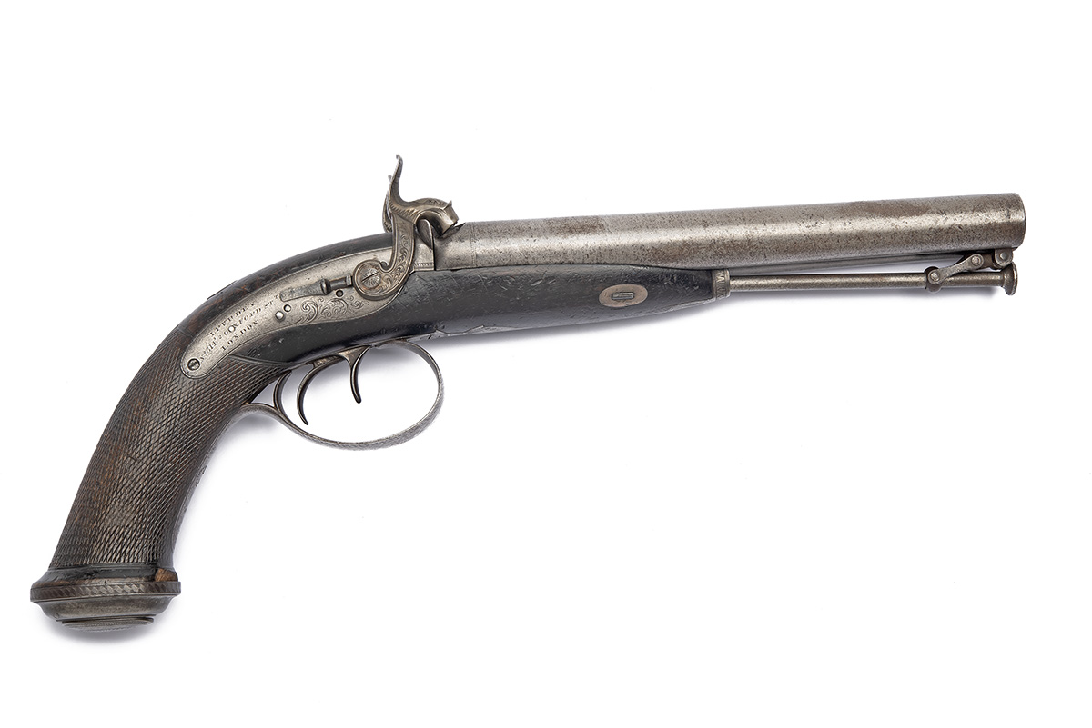 A .650 PERCUSSION DOUBLE-BARRELLED HOWDAH PISTOL, serial no. 2100,