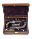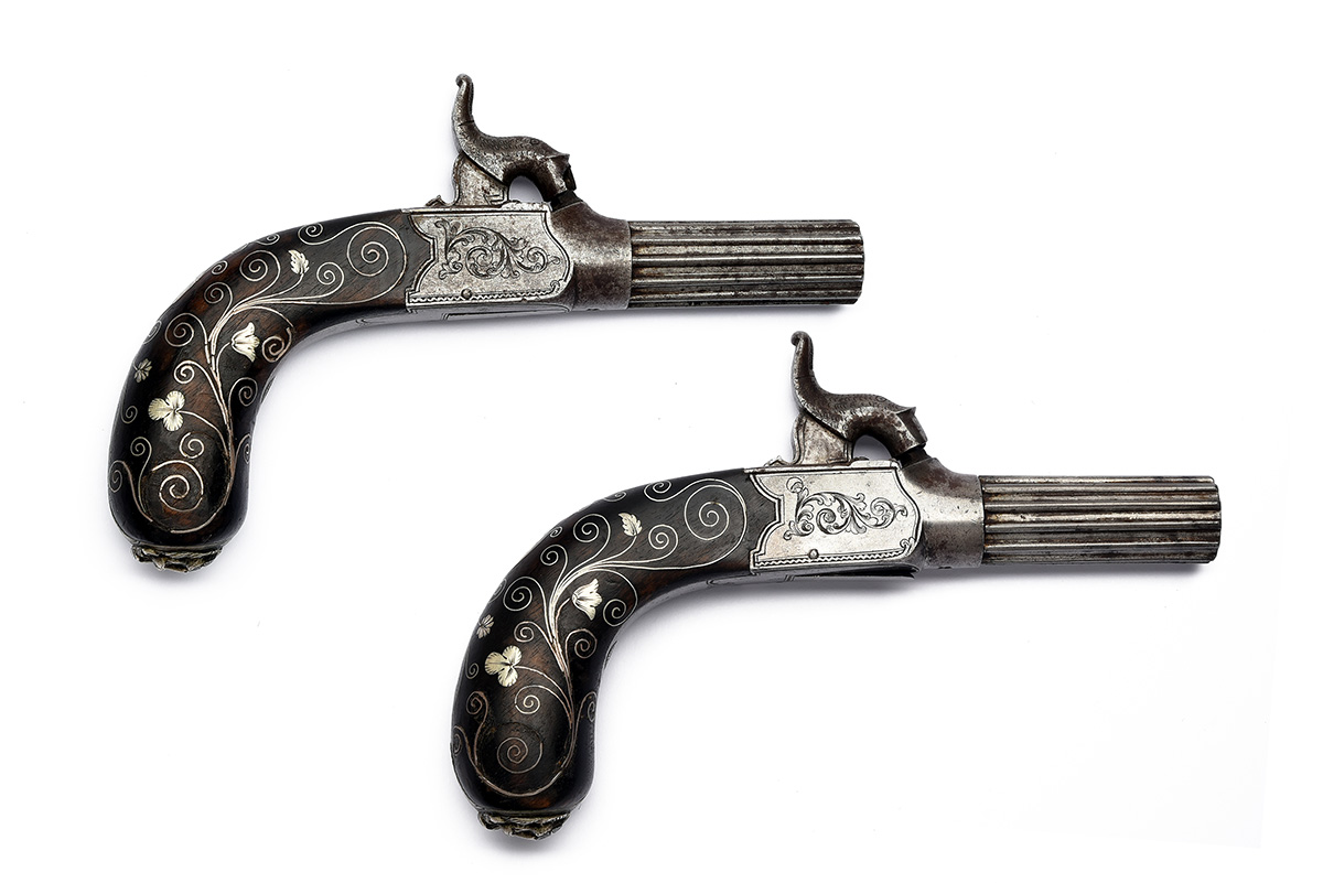 circa 1835, with fully reeded turn-off 2in. iron barrels starred at the muzzle for a key, Birmingham proofs, borderline and scroll engraved boxlock actions with central hammers and flush folding automatic triggers, the top-tangs signed 'C. PIPER, CAMBRIDGE', smooth walnut bag-shaped butts inlaid with white metal vines and flowers, white metal lions-mask caps and traces of finish, in their mahogany storage-case lined and compartmented in purple velvet and including a small Dixon flask, scissors mould and later oil bottle