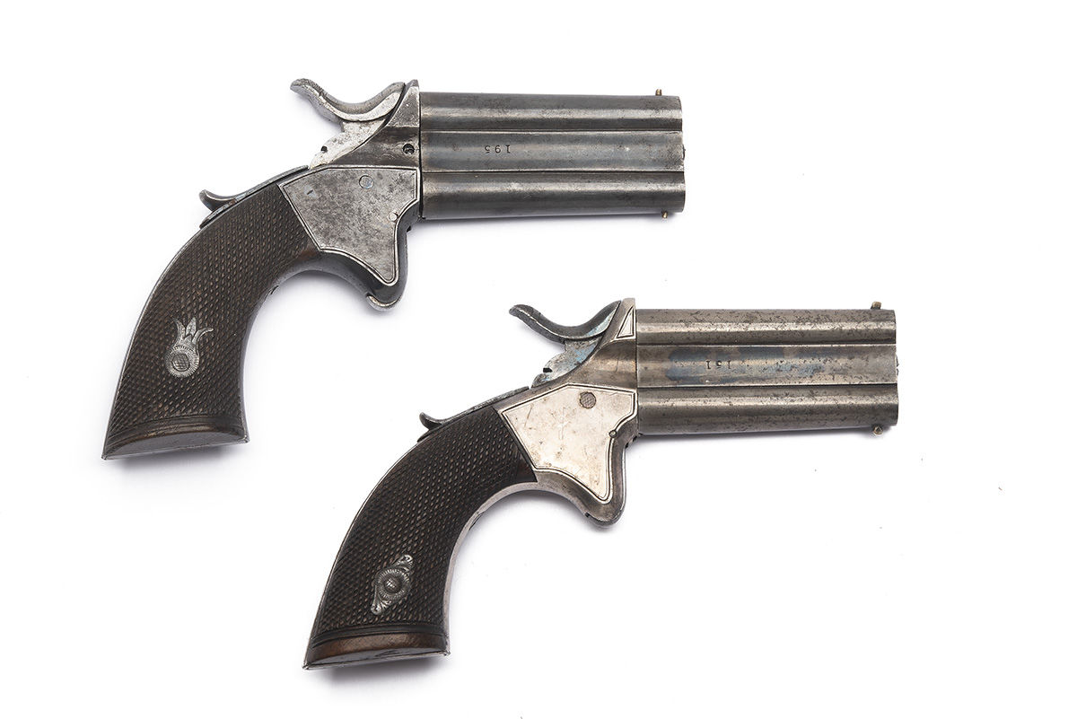 A CASED PAIR OF .30 (RIMFIRE) WOODWARD'S PATENT TURN-OVER VEST PISTOLS, serial numbers 151 and 195,