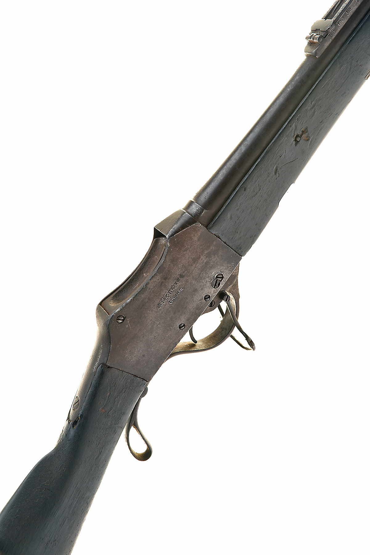 A .577/450 NEPALESE GAHENDRA SERVICE RIFLE, circa 1880s, with 32 1/2 in. sighted barrel, ladder rear-sight, falling block action, receiver with Nepalese script to the right side, lever with Nepalese script, single sling swivel and cleaning rod, full stock, heavily worn with rusting and pitting, heavy knocks and small losses to the stock