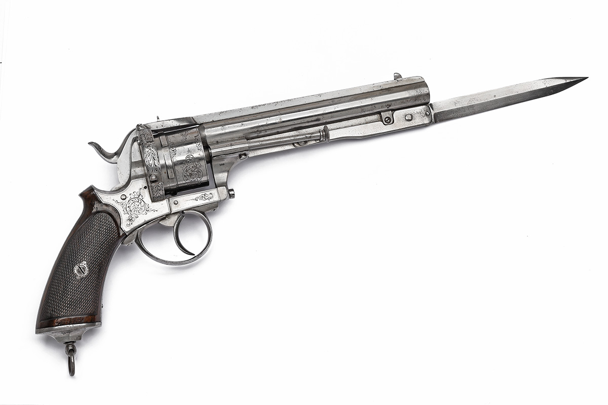circa 1860, the revolver of Lefaucheux style with in the white round 6 1/4in. barrel, applied full-length sighting-rib with wishbone top-strap, blade fore-sight, standing notch rear-sight, the underside of barrel with vertical bar mound for the signed folding bayonet, borderline and scroll engraved stepped frame, borderline and scroll engraved six-shot cylinder with external ratchet locking, loading gate to the pin-shield, double action mechanism with spurred hammer and guarded trigger and semi saw-handled chequered walnut grips with lanyard ring to the faceted grip-cap
