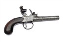 A 50-BORE FLINTLOCK POCKET-PISTOL SIGNED MEWIS & CO., no visible serial number, circa 1800, with round tapering 2 3/8in. turn-off barrel (frozen), squared boxlock action with central cock and guarded trigger, smooth walnut bag-shaped grip, frosting to finish