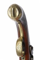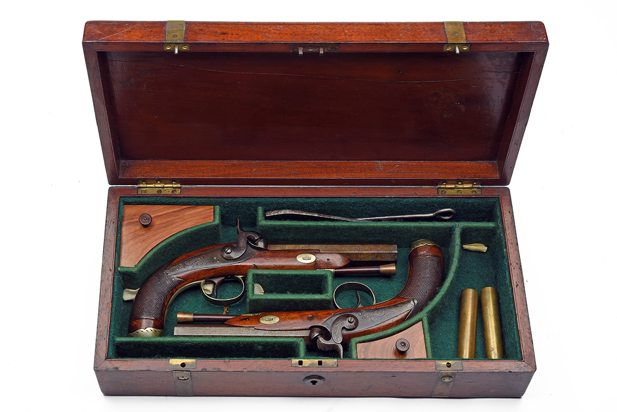 circa 1845, with variegated damascus 6in. octagonal barrels, bead fore-sights and shallow standing notch rear-sights, borderline and foliate engraved back-action locks, en-suite hammers, walnut half-stocks with chequered bag-shaped grips, each fitted witH a trap at heel with 'skull-cracker' lid, nickel furniture and under-barrel ramrods, in a converted late Georgian instrument case adapted for these pistols and containing a number of unassociated accessories
