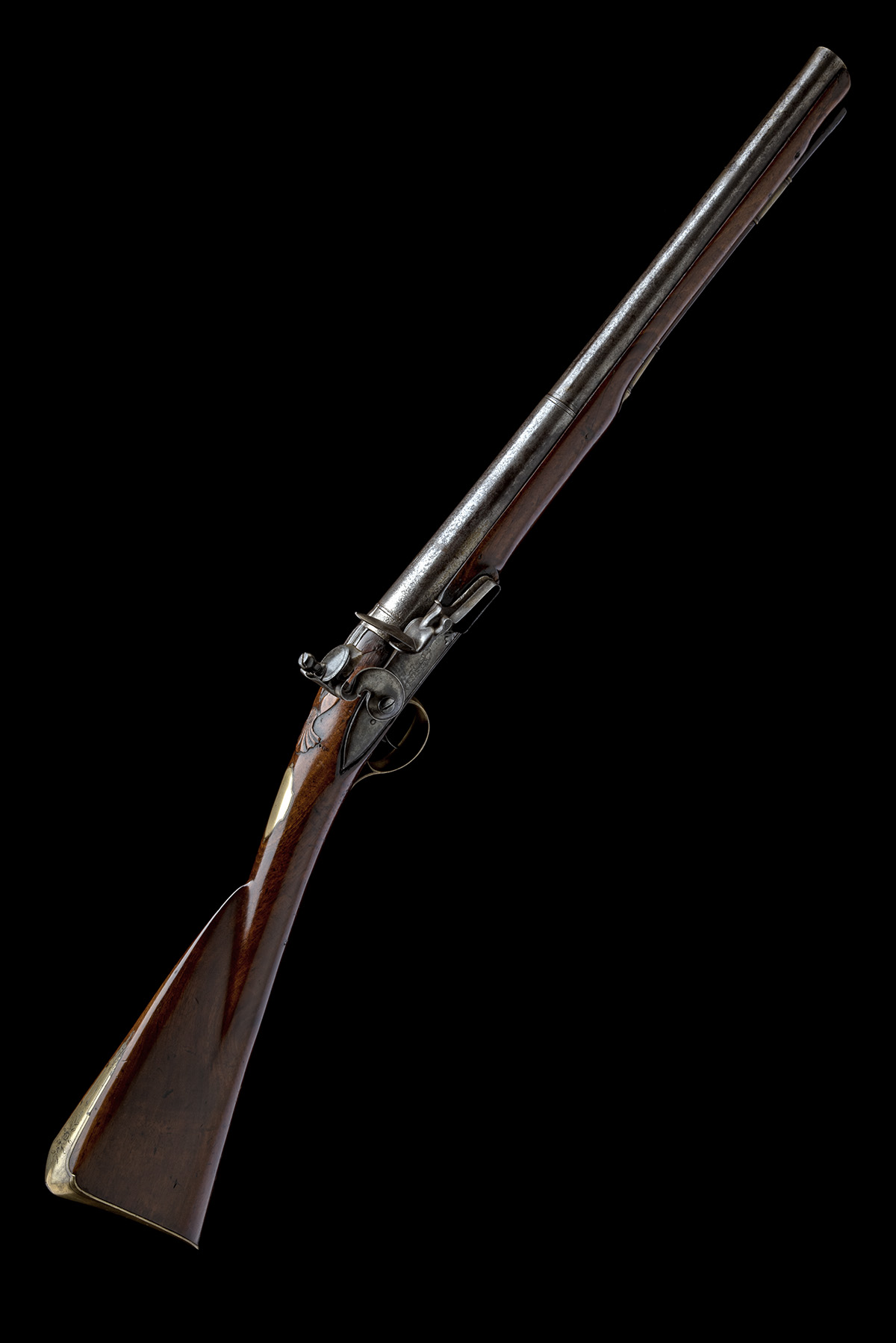 circa 1770, probably cut-down from a pre-existing officer's fusil, with two-stage round iron 17in. barrel, the top marked 'TEMPLE BARR LONDON', moulded band at breech bisected by a narrow sighting groove extending onto the engraved top-tang, rounded lock with raised borderline and signed 'NEWTON' within an embellished banner below the shallow rainproof pan, swan-necked cock, moulded frizzen with engraved bridle, feathered tip to the frizzen-spring, walnut hand-rail full-stock, engraved brass furniture except for the 'Elliot' style side-plate, ramrod throat and single pipe, period ramrod (frozen)