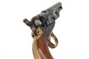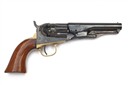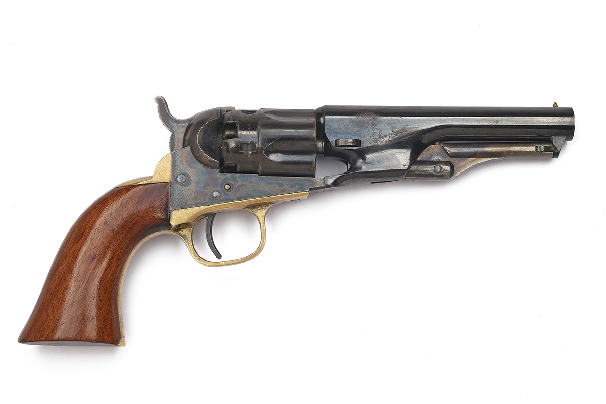 for 1867, with period London reblued 4 1/2in. barrel, the top signed 'ADDRESS COL. SAML. COLT NEW-YORK U.S. AMERICA' (rubbed but legible), bead fore-sight, colour hardened open iron frame marked 'COLTS PATENT', blued stepped and fluted five-shot cylinder, single action mechanism with blued trigger and colour hardened hammer, brass grip-straps and trigger guard, smooth flared walnut one-piece grip and creeping under-barrel rammer
