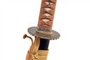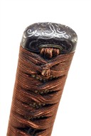 believed late 17th century, with 26 1/2in. blade in a good state of polish (one small inclusion near guard on left side), prominent hamon, moulded copper habaki, round iron tsuba with stylised radial 'petals' and inlaid in gold scrolls, square tipped tang with two mekugi-ana and signature, brown cotton-bound ray-skin grip, en-suite furniture and in a black lacquered wooden scabbard with further cotton bindings and a plain shira-saya storage scabbard
