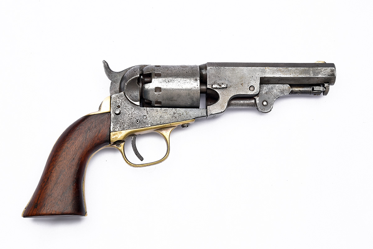 A .36 PERCUSSION MANHATTAN 5-SHOT SERIES III 'NAVY' REVOLVER, serial number 28903, circa 1862, with 4 in. sighted octagonal barrel, open frame, 12-stop cylinder, walnut grips, worn with pitting and scrubbed of all engraving and markings, replaced grips, 9 in. overall length