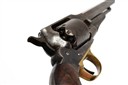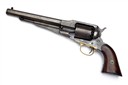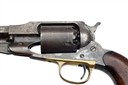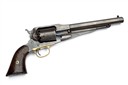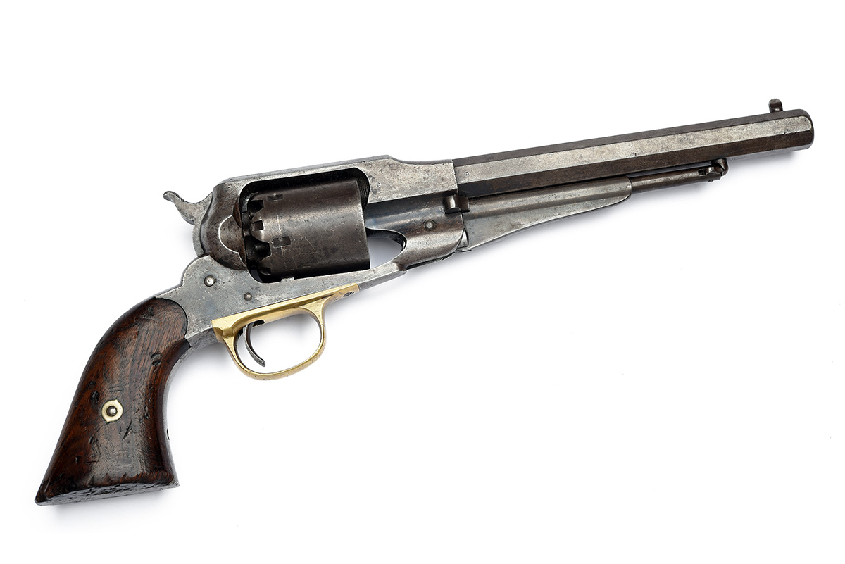 with blued octagonal 8in. barrel signed on the top-flat 'PATENTED SEPT 14 1858' over 'E. REMINGTON & SONS, ILION, NEWYORK U.S.A.' over 'NEW MODEL', blued solid frame, blued plain six-shot cylinder, smooth flared walnut grips with martial cartouche (chipping around lower edges), brass trigger guard, blued rammer and trigger, colour hardened hammer, fair amount of original finish remaining