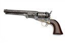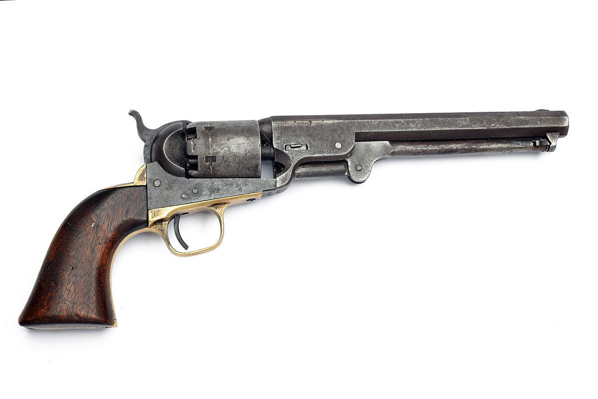 for end of 1861, with octagonal 7 1/2in. barrel (some bruising), the top-flat signed 'ADDRESS COL SAML COLT NEW-YORK U.S. AMERICA, plain cylinder scrubbed of scene, open iron frame, brass grip-straps and trigger guard, smooth walnut grip, wedge replaced