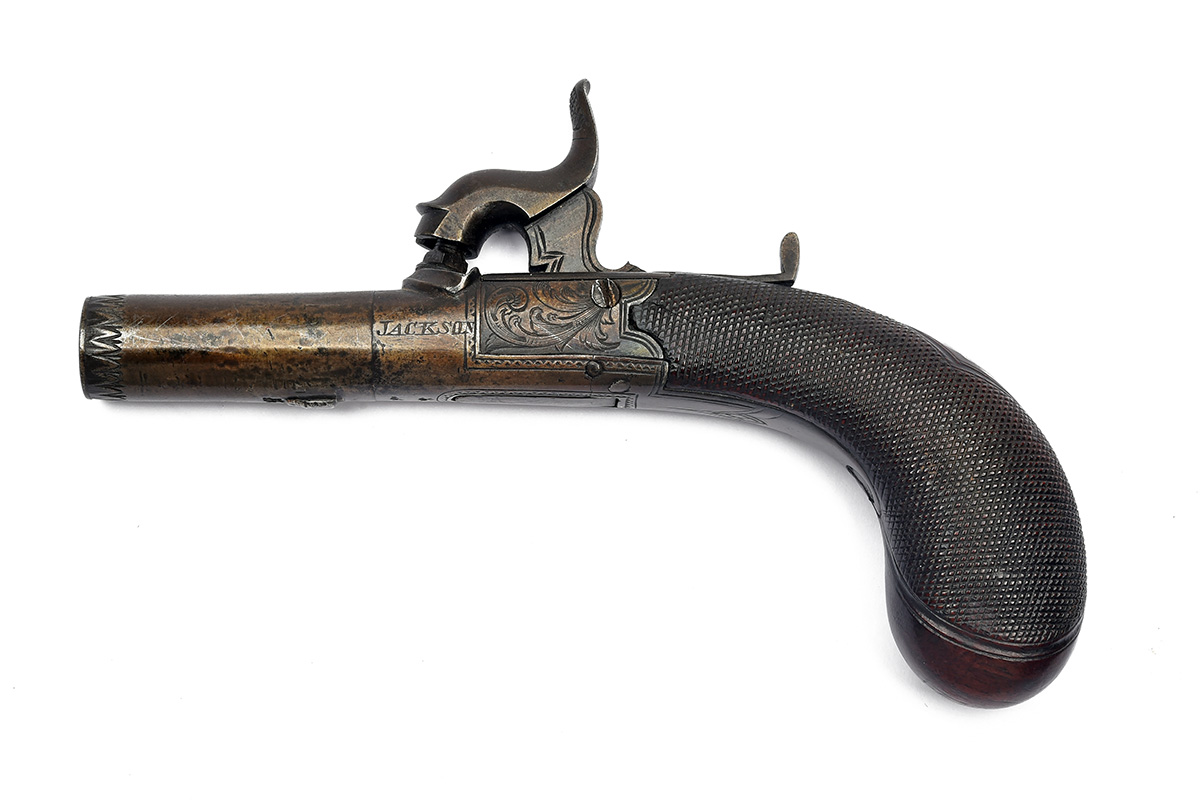 A 100-BORE PERCUSSION MUFF-PISTOL OF SMALLER SIZE SIGNED JACKSON, NOTTINGHAM, no visible serial number,