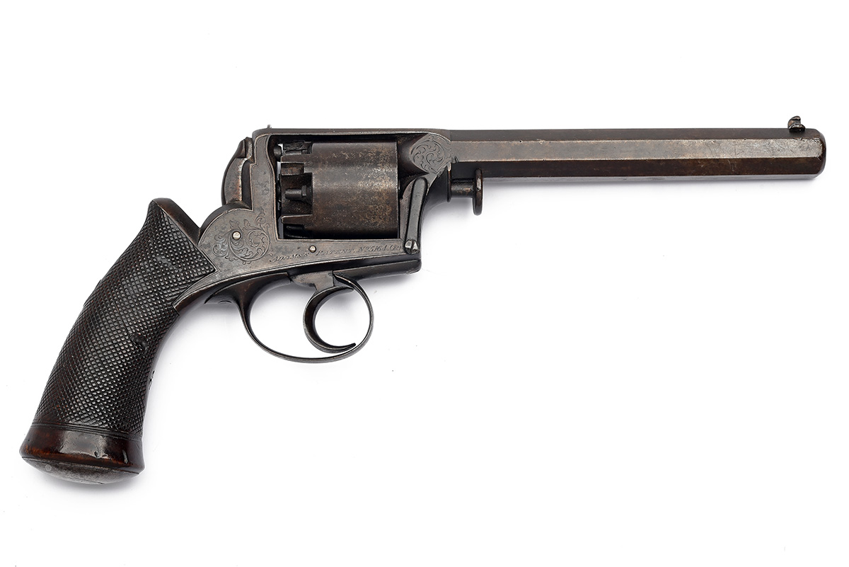 circa 1852, with octagonal 6 1/2in. barrel, the top-strap and top-flat of barrel with signature 'DEANE ADAMS & DEANE (MAKERS TO H.R.H. PRINCE ALBERT) 30 KING WILLIAM ST'T LONDON', borderline and scroll engraved action, plain five-shot cylinder, spurless hammer, guarded trigger and chequered walnut grip with domed iron cap with central trap, no provision for rammer, the whole darkly stained