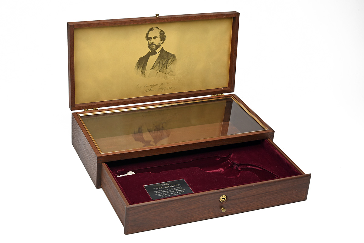A 'SAM COLT 1873 PEACEMAKER CENTENNIAL' PRESENTATION CASE, with cal .45 colt '1873 PEACEMAKER CENTENNIAL 1873' colt on exterior lid, interior lid with a picture of sam colt, glass presentation case with a plague reading 'PEACEMAKER commemorating the 100th anniversary of the 45 cal. single action army revolver which came to be known as the PEACEMAKER, purple baize lining, pull out draw, brass lock with key