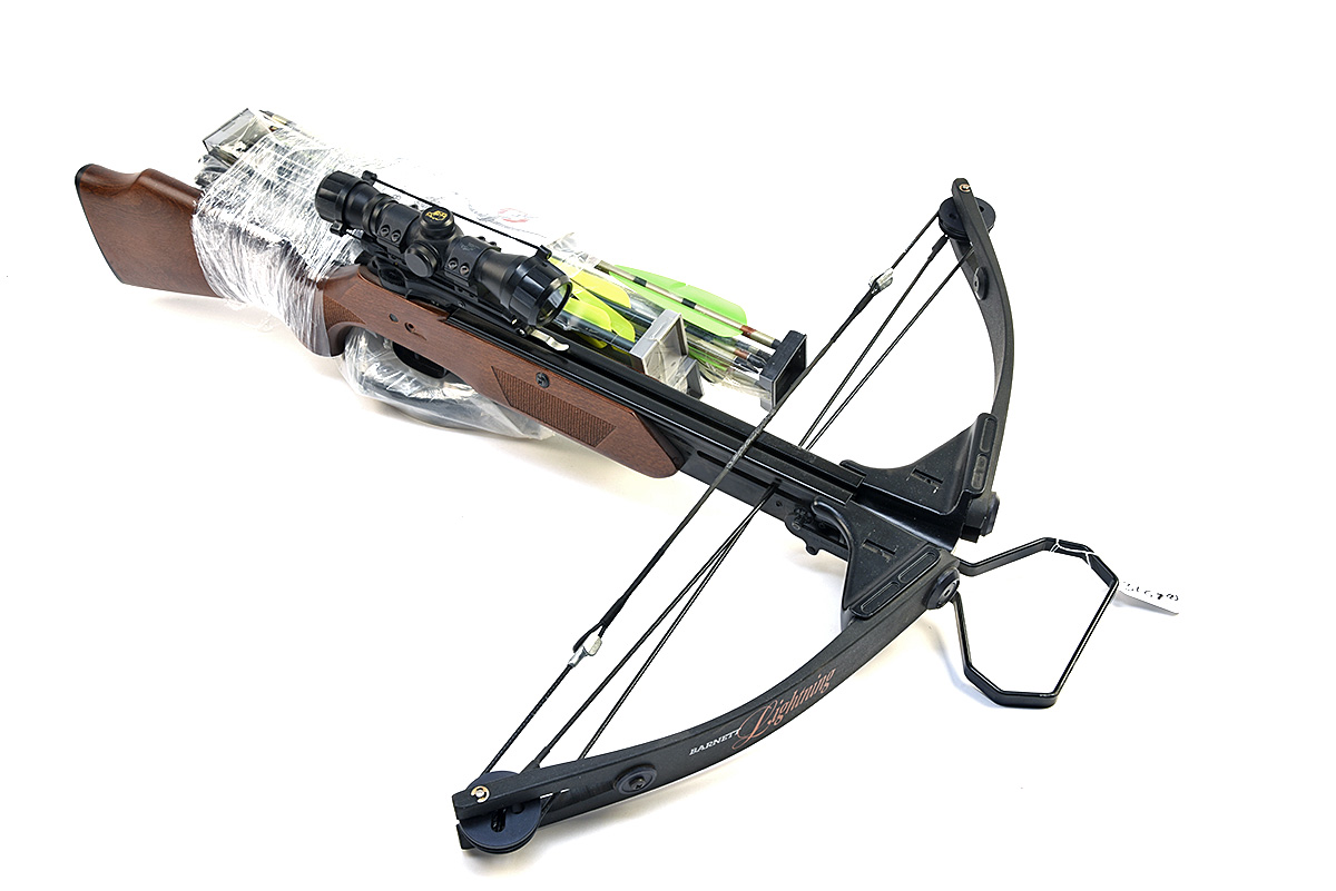 A LIGHTLY USED 'BARNETT' LIGHTNING COMPOUND CROSSBOW, 'BARNETT' 4X32 SCOPE, FIFTEEN UNUSED BOLTS AND SPARE PARTS, wood stock, 150lb draw weight, 50m effective range, 10 'BARNETT' 16in. bolts, 5 'BARNETT' 20in. bolts in original packaging, includes spare bow arms, string and related items (2)