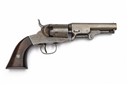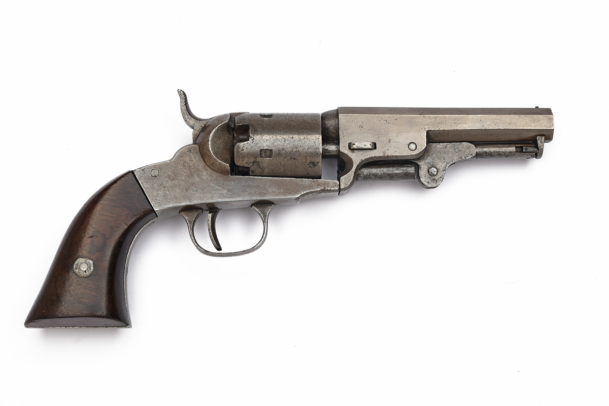 circa 1858, with octagonal 4in. barrel signed on the top-flat 'MANHATTAN FIRE ARMS MANUF'G CO. NEW YORK', bead fore-sight, the hammer nose with rear-sight notch, plain open iron frame, plain five-shot cylinder with five locking notches, single action mechanism, iron grip-straps and trigger guard, smooth flared walnut grips and articulated under-barrel rammer