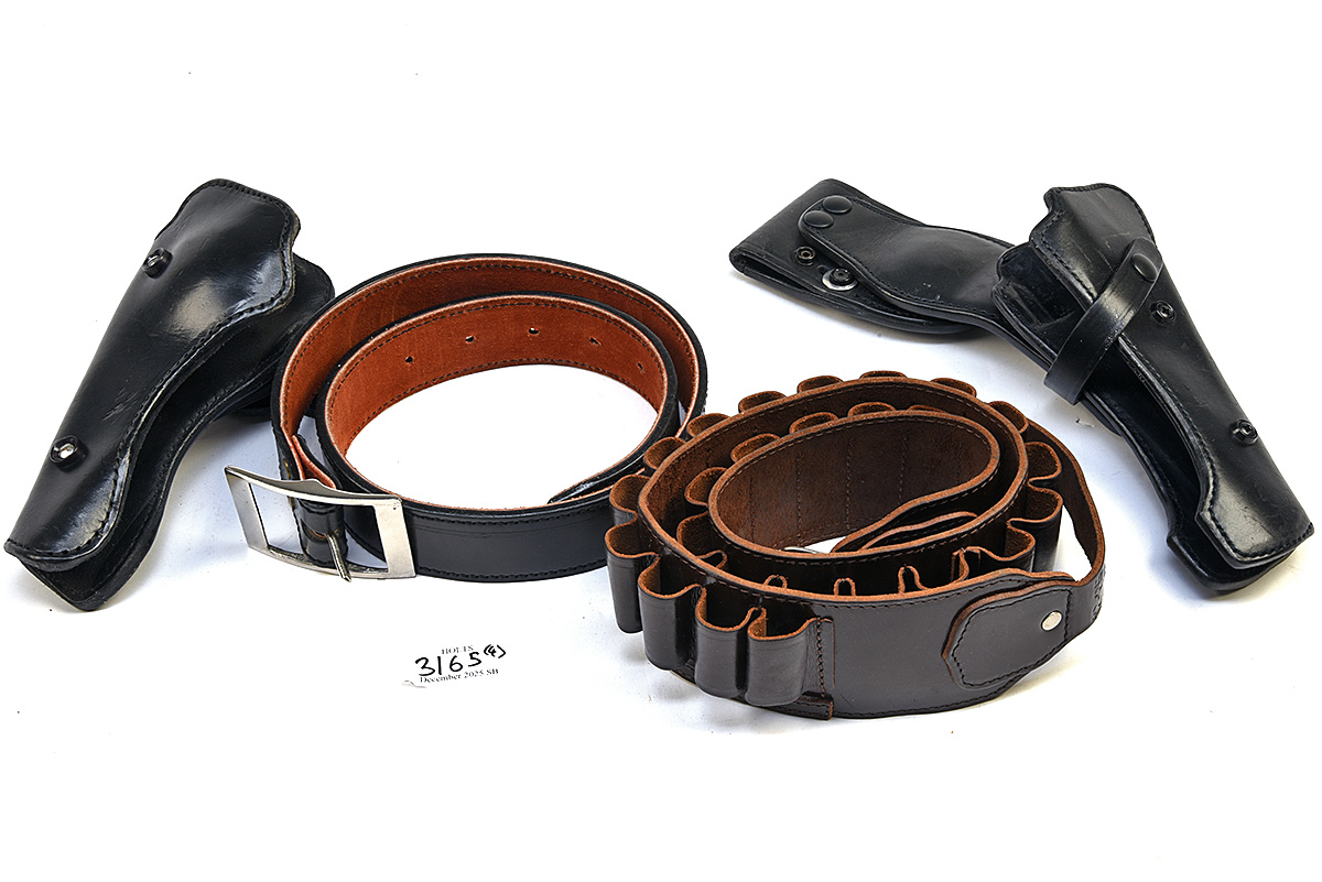 TWO LEATHER REVOLVER HOLSTERS, BELT AND CARTRIDGE BELT, (4)