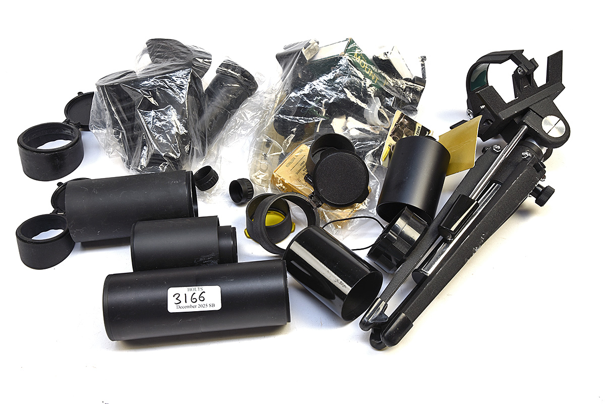 A QUANTITY OF SCOPE RING MOUNTS AND RELATED ITEMS, comprising of 9 pairs of assorted scope rings, 5 rubber eye-pieces, 5 sunshades, front and rear flip-up lens protector, spotting scope tri-pod among other sundries