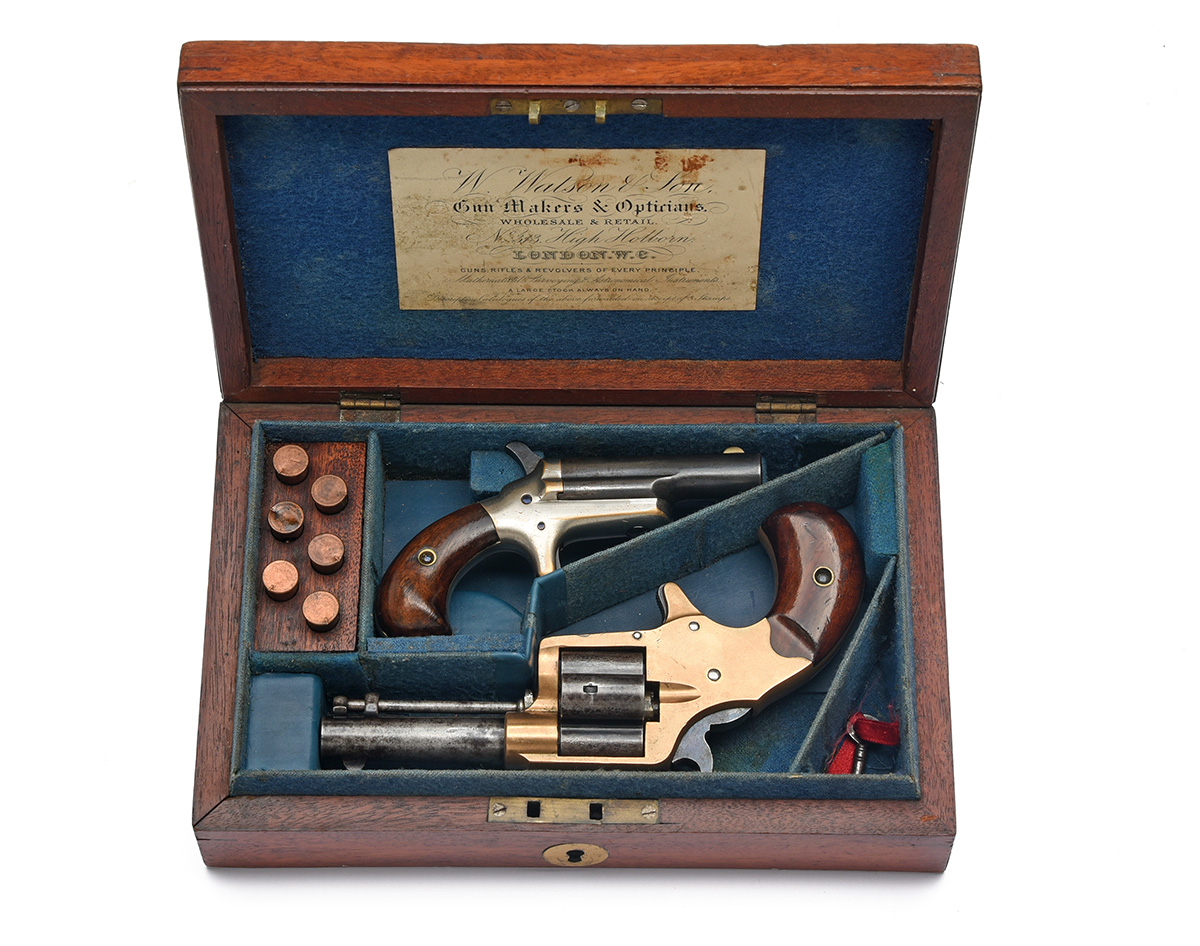 composed circa 1880, the first for 1871, with 3in. blued barrel signed on two lines 'COLTS HOUSE PISTOL' over 'HARTFORD CT. USA', solid frame with distinctive four-shot blued 'cloverleaf' cylinder, exposed hammer, spur trigger and smooth walnut birdshead grips, brass frame, bluing worn to barrel and cylinder, the second circa 1880, with reblued 2 1/2in. barrel signed 'COLT', plated open frame, exposed hammer, spur trigger and smooth walnut birdshead grips, in a mahogany case of apparent period manufacture lined and compartmented in blue baize for these pistols and bearing a 'W. Watson & Son' parchment trade-label inside the lid and together with six inert cartridges