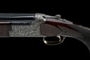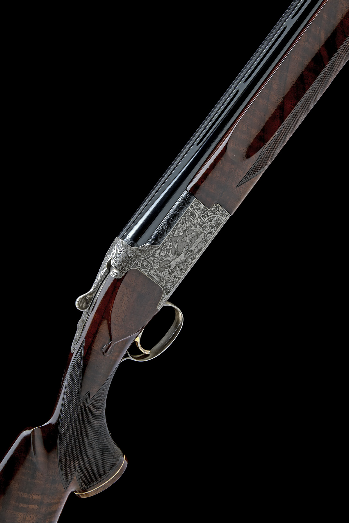 for 1985, 28in. nitro reproved barrels (in 1985) with 13mm ventilated matt top-rib, pearl inset bead fore-sight and intermediate bead-sight, 2 3/4in. chambers, bored approx. 1/4 and 3/4 choke, hold-open toplever, manual safety with integral barrel selector switch, gold-washed single trigger, rolled-edge triggerguard, the action carved in high relief with acanthus scrollwork surrounding game scene vignettes of hound and fowl, the underside with an oval engraved 'B.C. MIROKU PRESIDENT', signed 'M.K.', the furniture and fore-end iron engraved en suite, the triggerguard with a portrait of a spaniel retrieving mallard, sculpted fore-end wood, decorative ivorine diamond-shaped inserts to fore-end and pistolgrip, 14 7/8in. well-figured pistolgrip stock with blank silver shield-shaped escutcheon and including 1in. rubber recoil pad, weight 7lb. 11oz., with original Miroku Inspection Certificate