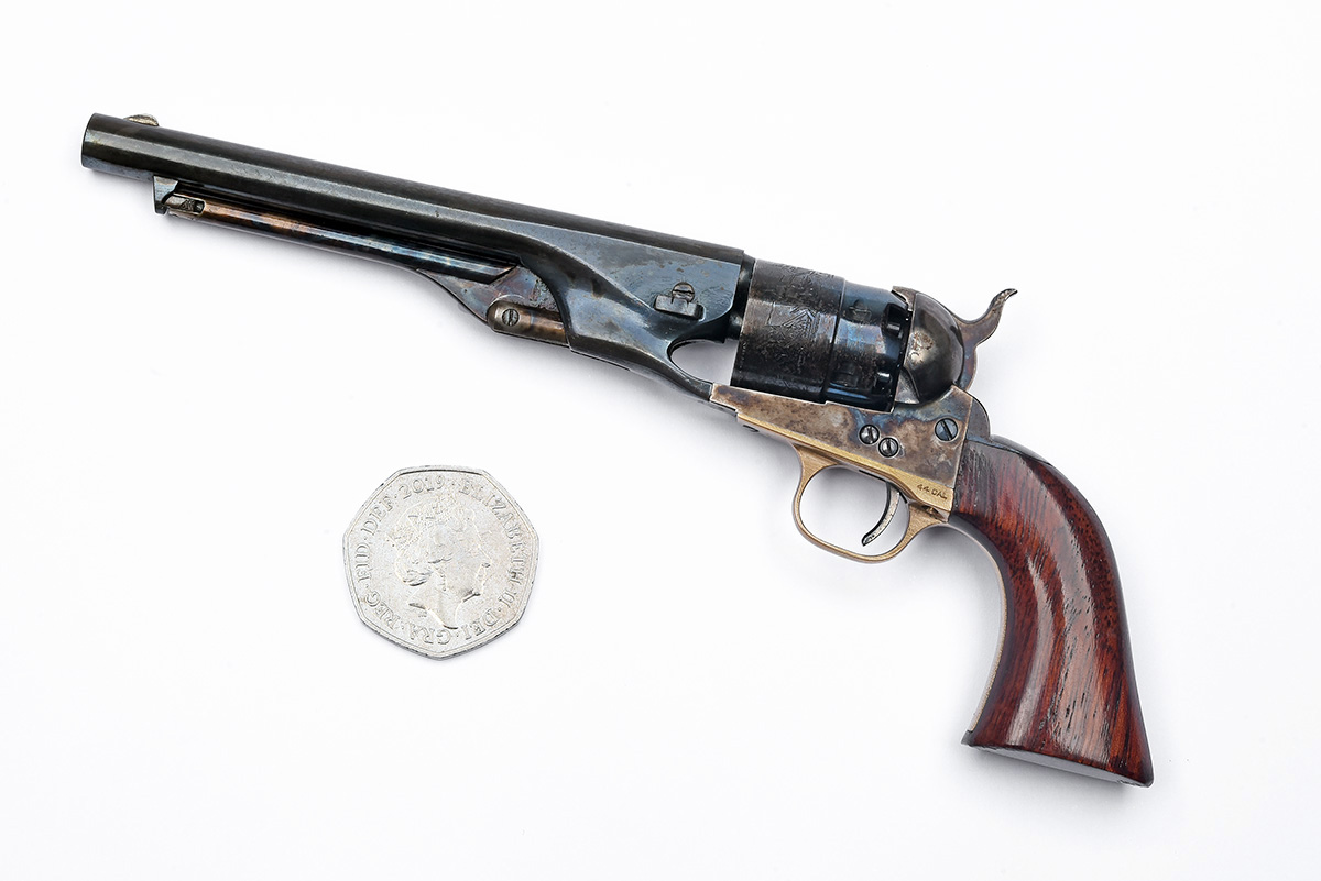 with blued round 3 3/4in. barrel, blued and stepped cylinder with roll engraved scene, colour hardened open iron frame, brass trigger guard and front-strap, iron back-strap with smooth flared walnut one-piece grip and creeping under-barrel rammer, good condition in a red velvet lined wood box