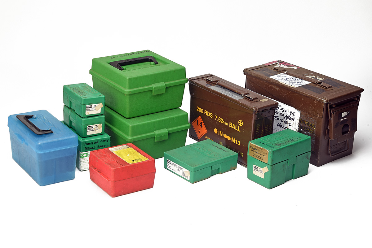 ELEVEN VARIOUS AMMUNITION STORAGE BOXES, comprising of 2 'MTM' R-100, RS-100, 2 medium rifle boxes, 2 medium pistol boxes,