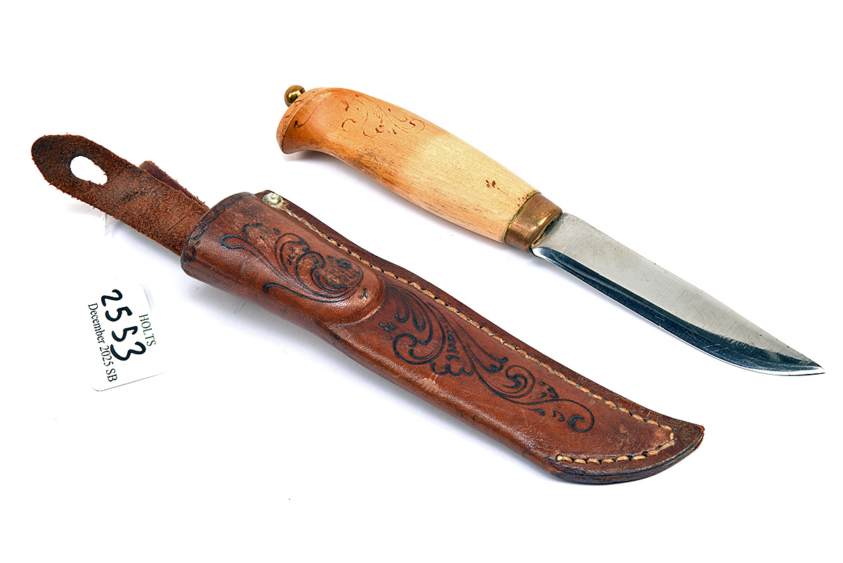 A VINTAGE 'BRUSLETTO' OUTDOOR KNIFE IN COWHIDE LEATHER SHEATH, approx. 4in. 'BRUSLETTO' stamped puuko blade, stick tang, brass bolster, brass pommel that secures to sheath, wood scale handle in decorative brown leather sheath
