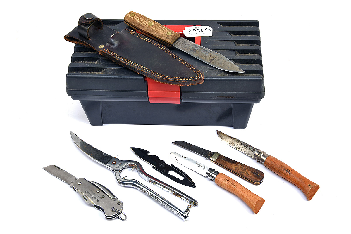 SIX VARIOUS POCKET/HUNTING KNIVES WITH A PAIR OF 'NOGENT' SHEARS IN TOOL BOX, comprising of 1 'OPINEL' approx. 3 1/4in clip point blade, steel bolster, beechwood handle, 1 'OPINEL' No.7 approx. 3in. round tip blade, steel bolster, beechwood handle, 1 unbranded 'MADE IN SHEFFIELD' approx. 2 3/4in sheepfoot blade, nickel silver bolster, wood scale handle, 1 'BRITISH ARMY KNIFE' approx. 2 1/2in sheepfoot blade, can and bottle opener, marlin spike, stainless steel scale handle reading 'THE GENUINE BRITISH ARMY KNIFE STAINLESS STEEL MADE IN SHEFFIELD ENGLAND' 1 unbranded approx. 2 1/4in blackened drop point blade with built in bottle opener on reverse, skeletal black steel handle, 1 unbranded approx. 5in. clip point fixed blade, full tang, wood scale handle in leather sheath, 1 'NOGENT' shears (7) in tool box
