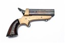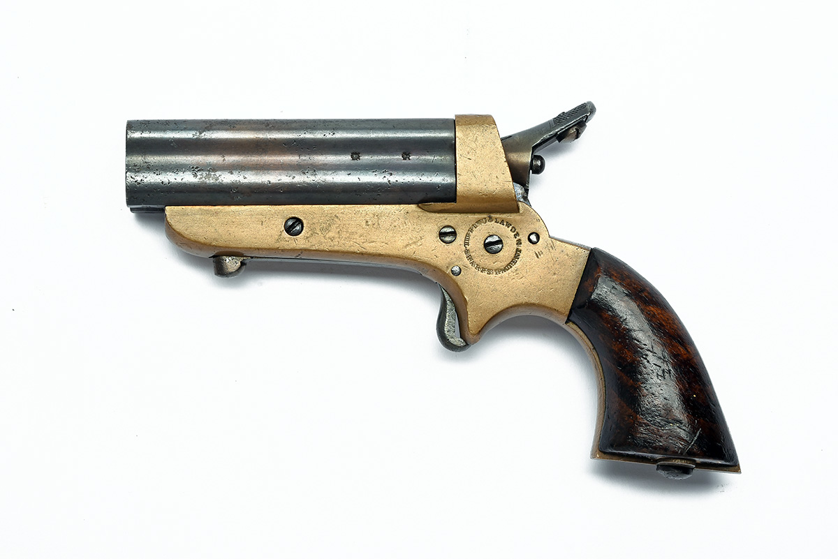 * A .31 RIMFIRE SHARPS PATENT FOUR-BARRELLED DERRINGER PISTOL SIGNED TIPPING & LAWDEN, serial no. 5511, circa 1870, with 2 7/8in. slide-forward barrel group, brass open frame with external hammer, spur trigger and replacement flared walnut grip