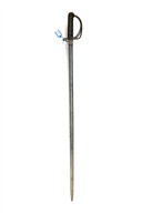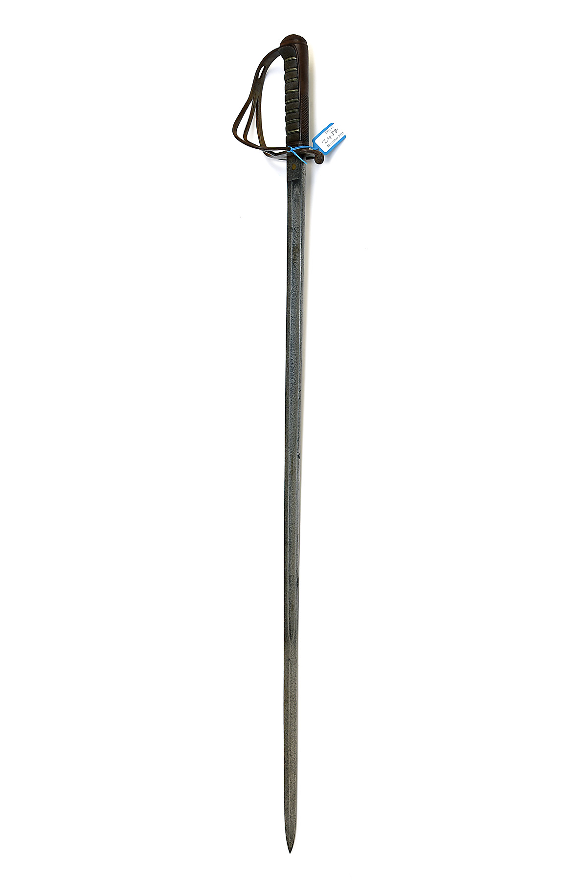 * AN UNUSUAL PATTERN 1821 LIGHT CAVALRY OFFICER'S SWORD WITH VR&I ROYAL CYPHER, mid-19th Century, with 36 in. single-edged steel blade etched on both sides with scroll-work and crown above royal cypher of 'VR&I' [for Victoria Regina et Imperatrix (Victoria Queen and Empress)], indicative of being made for use in India, ricasso with 'proved' plug, with indistinct heavily rubbed maker's or retailer's details, hilt with three-barred guard and back stamped '39A', wire-bound fish-shin grip, worn, blade rubbed and evenly stained, surface rusting to hilt, no scabbard