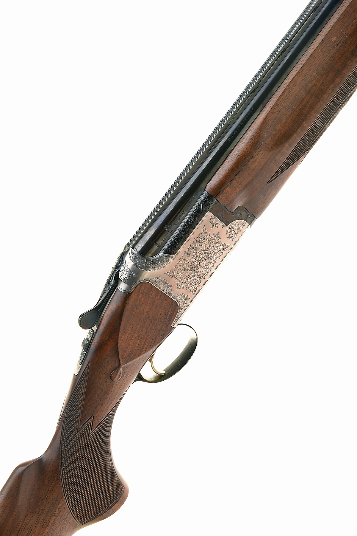 MIROKU FIREARMS MFG. CO. 12-BORE SINGLE-TRIGGER OVER AND UNDER EJECTOR, serial no. 80294PZ, dated 1981, 28in. nitro barrels with 10mm ventilated matt top-rib, 2 3/4in. chambers, bored approx. true cyl. in both, hold-open toplever, manual safety with integral barrel selector switch, gold-washed single trigger, beaded border and acanthus scroll engraving, bright finish, 14 1/4in. pistolgrip stock including buttplate, weight 7lb. 11oz.