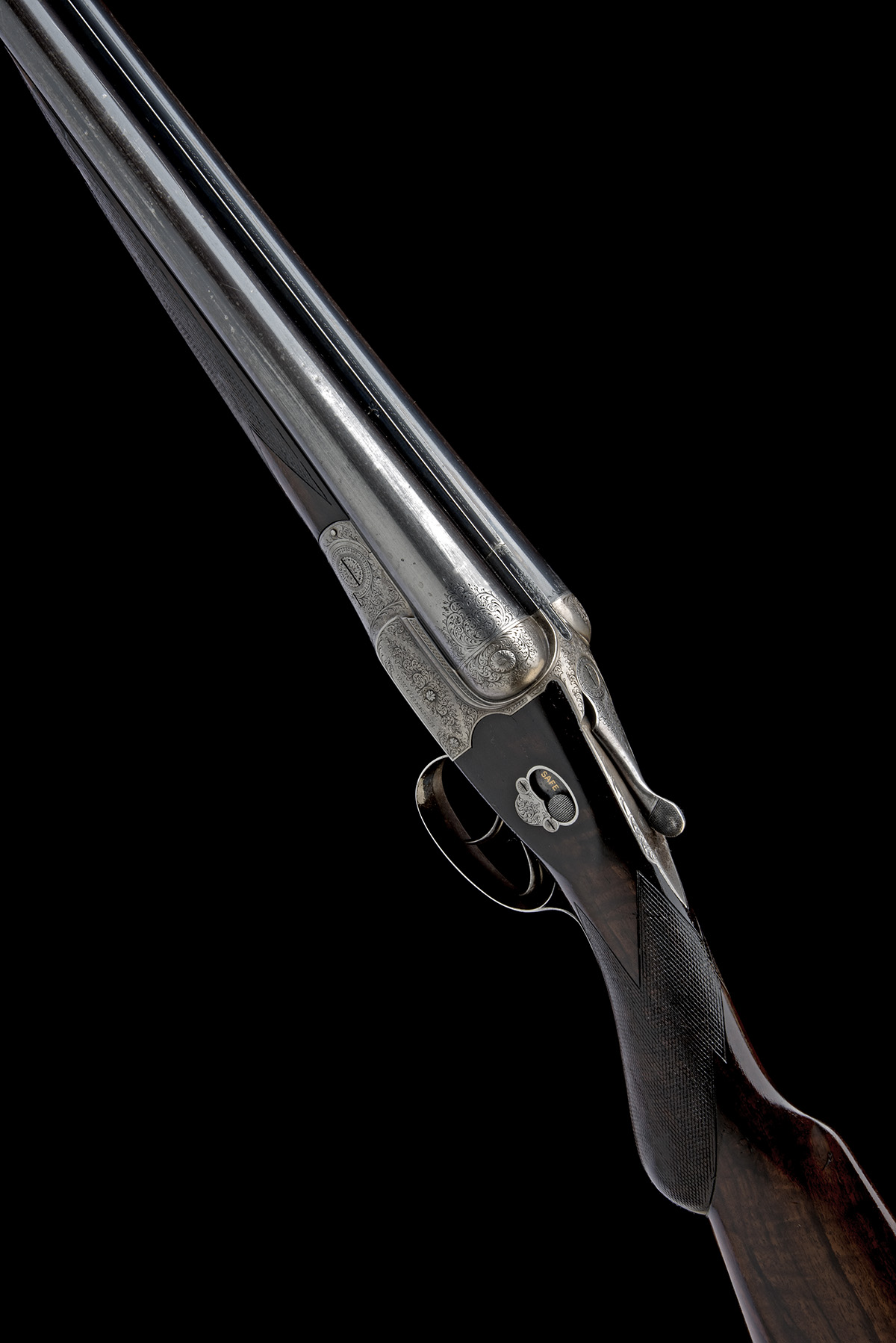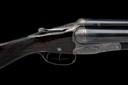 for 1935, 28in. nitro Greener trade mark barrels with acanthus scroll detailing at the breech ends, the rib engraved 'W.W. GREENER. MAKER. 40 PALL MALL. LONDON. S.W. WORKS. ST. MARY'S SQUARE BIRMINGHAM.' and with acanthus scroll detailing at the breech end, 2 1/2in. chambers, bored approx. 1/4 and 1/2 choke, some pitting, scoop-back stepped treble-grip action with ropework engraved side bolsters, manual side safety with gold-inlaid 'SAFE' detail, rolled-edge triggerguard, fine acanthus scroll engraving, retaining very slight traces of colour-hardening and finish, 15 1/4in. figured semi-pistolgrip stock including buttplate, fore-end with Deeley & Edge patent release catch, horn finial, weight 6lb. 10oz., in a canvas and leather guncase