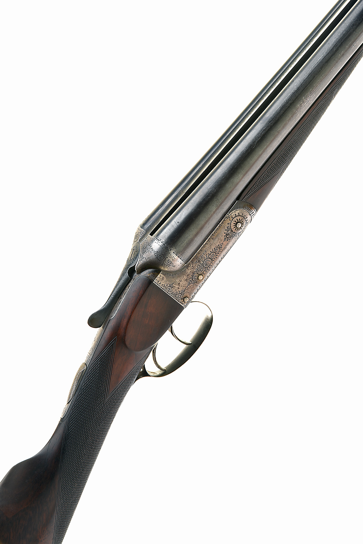 JOHN WILKES 12-BORE BOXLOCK EJECTOR, serial no. 4449, circa 1900, 30in. nitro reproved barrels, 2 1/2in. chambers, bored approx. imp. cyl. and full choke, treble-grip action, automatic safety, border and partial scroll engraving, retaining traces of original colour-hardening and finish, 14 3/4in. stock including 3/4in. rubber recoil pad, weight 6lb. 12oz., in a leather 'Gunmark' guncase