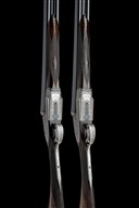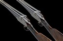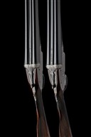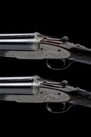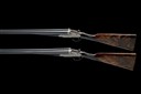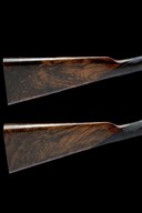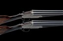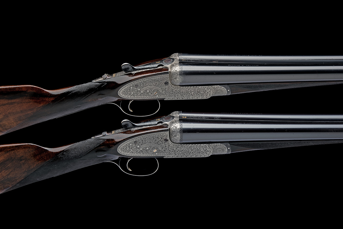 circa 1903, 30in, nitro barrels (No.2 replacements by the makers in 2005), the ribs gold-inlaid '1' and '2' at the breech ends, the tubes engraved 'HOLLAND & HOLLAND. 98 NEW BOND STREET. LONDON.' (No.1) and 'HOLLAND & HOLLAND . BRUTON STREET. LONDON.' (No.2), No.1 with 2 1/2in. chambers, bored approx. imp cyl. choke in both, wall thicknesses below recommended minimum, No.2 with 2 3/4in. chambers, bored approx. imp. cyl. and 1/4 choke, toplevers gold-inlaid '1' and '2', automatic safeties with gold-inlaid 'SAFE' details, gold-inlaid cocking-indicators, semi-selective single triggers, best bold Royal scroll engraving, the undersides with elaborate cartouches engraved 'ROYAL HAMMERLESS EJECTOR' and ovals engraved 'PATENT SINGLE TRIGGER', 14 7/8in. figured stocks including 1 1/4in. wooden extensions, weight 6lb. 4oz. (No.1) and 7lb. 1oz. (No.2), in their brass-cornered oak and leather case with internal protecting flap