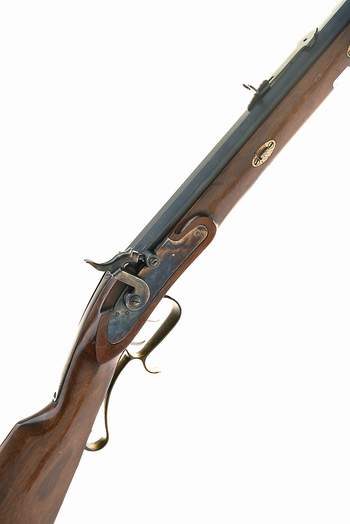A REPRODUCTION .45 PERCUSSION ARDESA RIFLE, MODEL 'HAWKEN', serial no. 14-13-012152-11, for 2011, with 32in. blued octagonal sighted barrel, tunnel fore-sight, Buck-horn rear-sight, colour hardened lock, walnut half-stock, brass furniture and wood ramrod