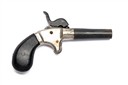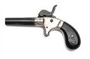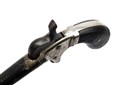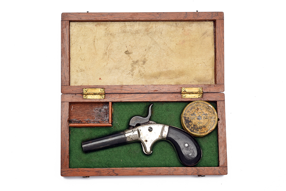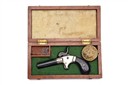 A CONTINENTAL 120-BORE PERCUSSION SINGLE-SHOT PISTOL, SIGNED UNION, no visible serial number, circa 1870s, probably Belgian, with 2 in. round turn-off barrel crudely stamped 'UNION', nickelled frame, plastic grips, worn, barrel frozen, appears crudely manufactured, action sloppy, together with a worn converted box with split lid containing a remaindered Belgian tin of blanks