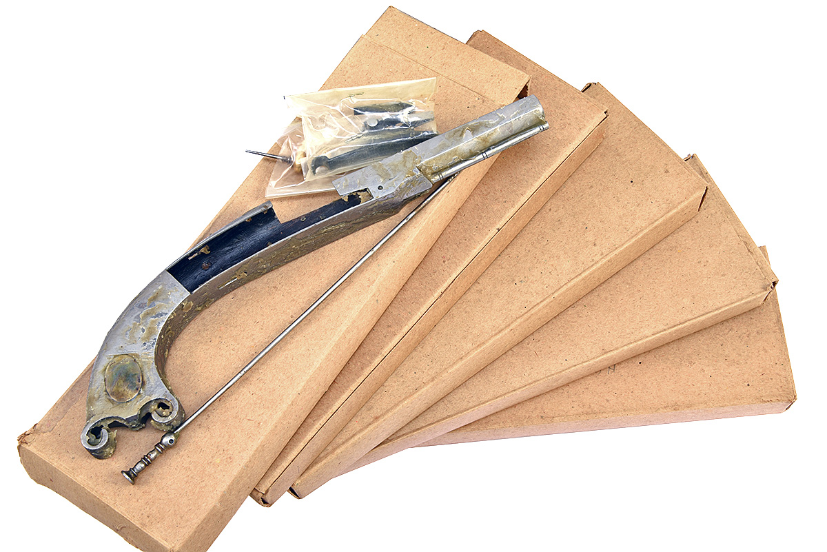 FIVE REPRODUCTION SCOTTISH PISTOL SETS OF STEEL AND PARTS IN ORIGINAL PACKAGING, each set includes a rammer, a set of springs, button trigger, vent-hole pick, and steel stock with ram's-horn finials (no barrels or lock parts other than springs) believed to have been manufactured by Coach Harness, Haughley, Suffolk, new-old stock from the 1980s or 1990s (qty)