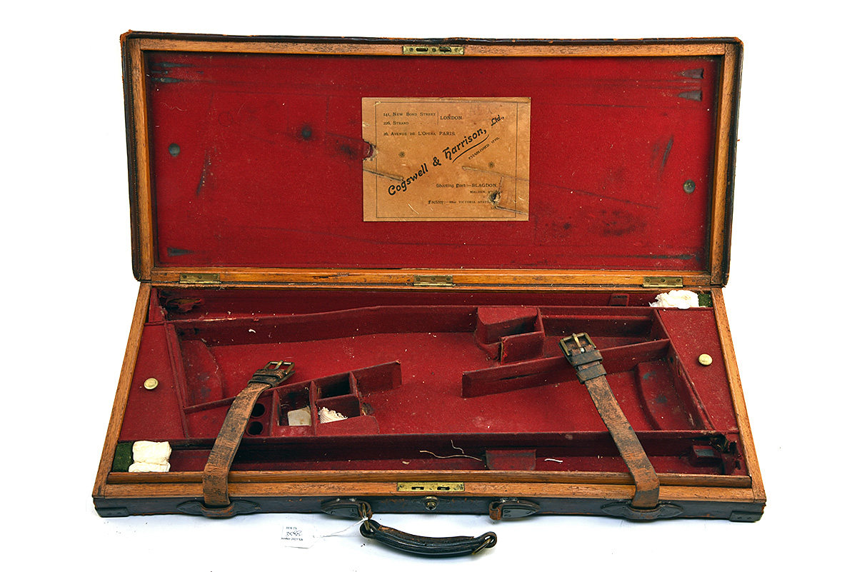 A COGSWELL & HARRISON BRASS-CORNERED DOUBLE GUNCASE, fitted for 30in. barrels, the interior lined with red baize, a Cogswell & Harrison trade label, central brass push-button lock (key missing), the lid exterior marked 'H.E.A.'